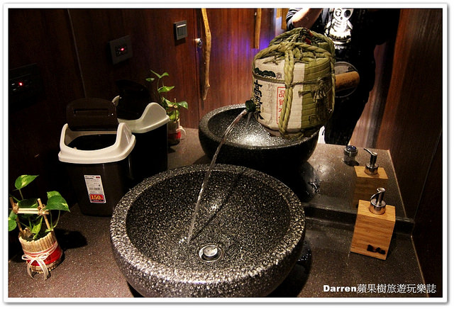 來上洗手間連洗手台設計都超特別,水龍頭是個小酒樽下面是用石頭打磨的盛水台日式風格很有巧思