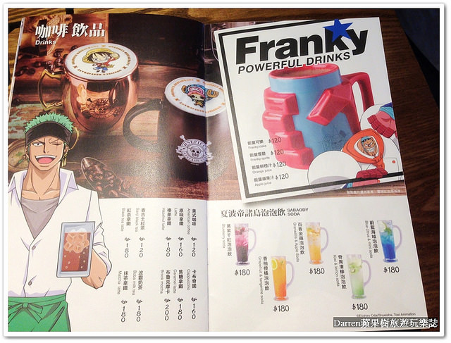 很喜歡這份MENU設計的方式,運用草帽海賊團的9位角色來設計品項及內容,光看圖片就讓人清楚明白