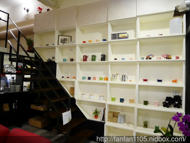 有一整面擺滿飾品與咖啡杯的牆面,從這裡可以到2樓