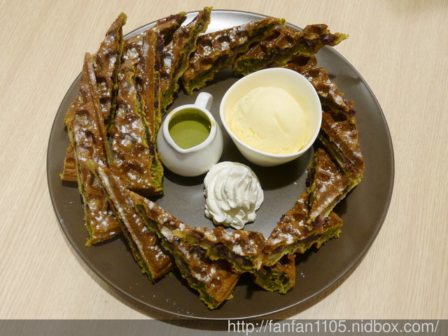 紅豆抹茶鬆餅還搭配香草冰淇淋、自製抹茶醬、鮮奶油,感覺很澎派耶!