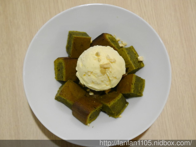 熱熱的抹茶蛋糕,搭配腰果與冰淇淋,