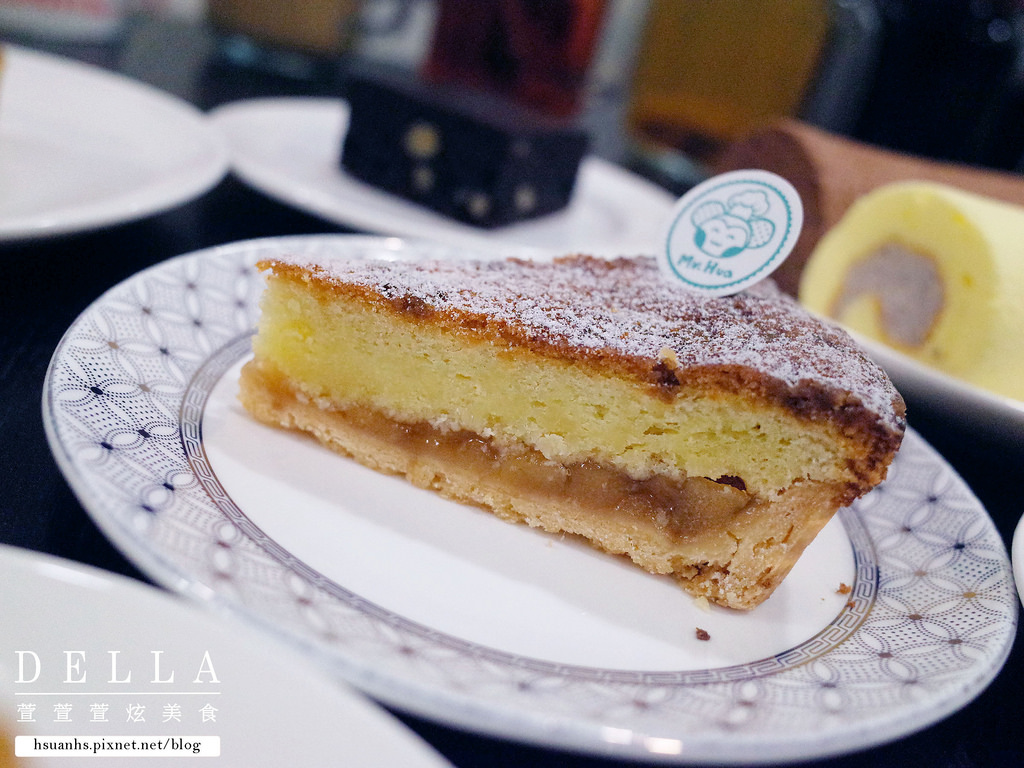 上層是檸檬餡、中間一層蛋糕體、下層是卡士達醬,最外在由塔皮包覆
