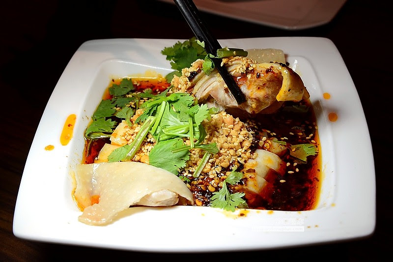 麻辣紅湯搭配白斬雞,雞肉切成大約一公分的厚度,肉質扎實也滿多汁的,沾滿了麻辣紅油一起入口,那股直衝腦門的辣味超過癮的!