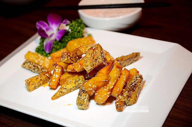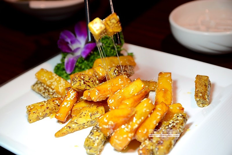 最後的甜點上桌,並且放上一碗冰水,店員說要趁熱把它們分開,不然就不好吃啦!!所以趁熱就開始拔絲吧!!芋頭、地瓜外層酥脆的糖衣撒上芝麻,內層是鬆軟綿密,芋頭和地瓜本身就很甜了,再加上外面的麥芽糖衣甜度大增!