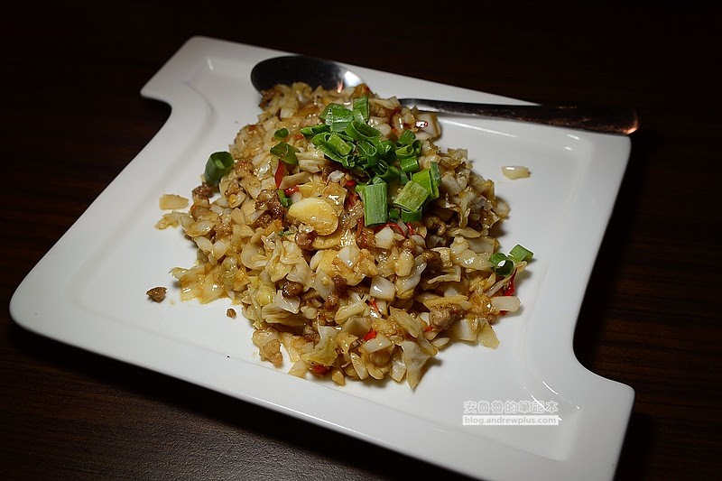 酸菜、高麗菜切丁和肉末、辣椒均勻拌炒,這道菜根本是拿來配飯的,如果只是單吃好像單調了些,但是扮在飯裡面後,肉末和酸菜的香味,還有高麗菜的甜,會勾人的胃口多扒好幾口飯