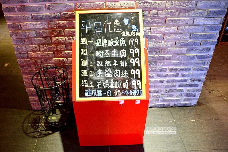 ▼門口有平日優惠的公告,好吃的酸菜魚周一只要199,划算的價格讓安魯魯也想周一來吃
