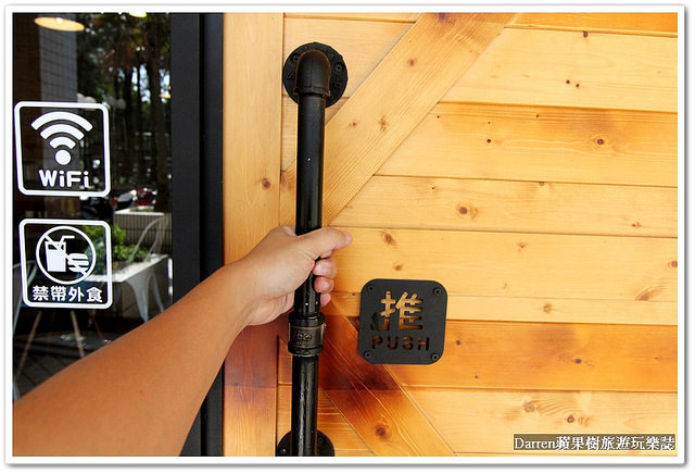 餐廳招牌小小一個有點不太明顯,黑色鐵窗框加上木頭門整體門面簡約又好看,水管手把帶點工業風元素
