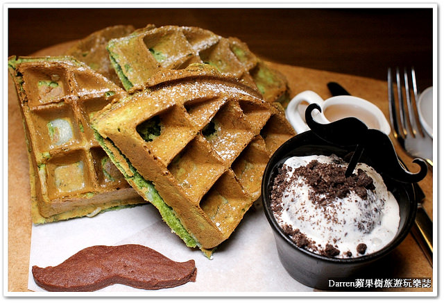 抹茶鬆餅是店家推薦的最新品項,有4片抹茶鬆餅旁邊還有一杯冰淇淋,鬆餅可以沾上冰淇淋吃起來感覺不一樣