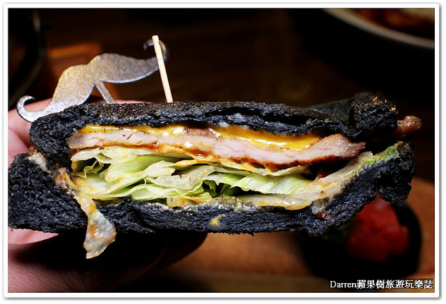 竹碳厚片吐司壓烤成帕里尼,從側面看花生起司醬很勾人,咬下去其實竹碳本身沒啥味道