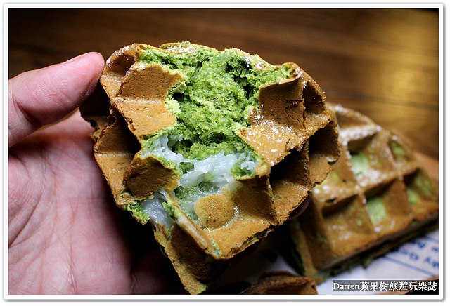 這鬆餅最心機的地方就是裡面有麻糬,吃起來又脆中間還有麻糬QQ綿綿的口感,抹茶鬆餅越嚼越香很好吃
