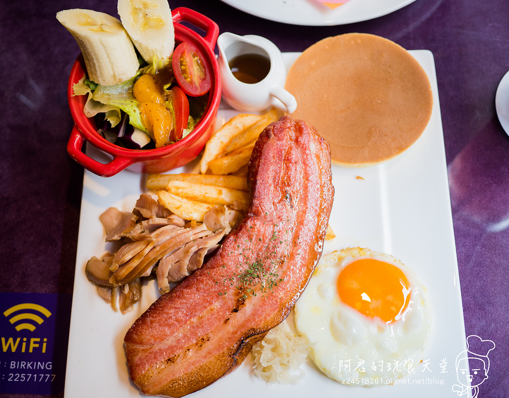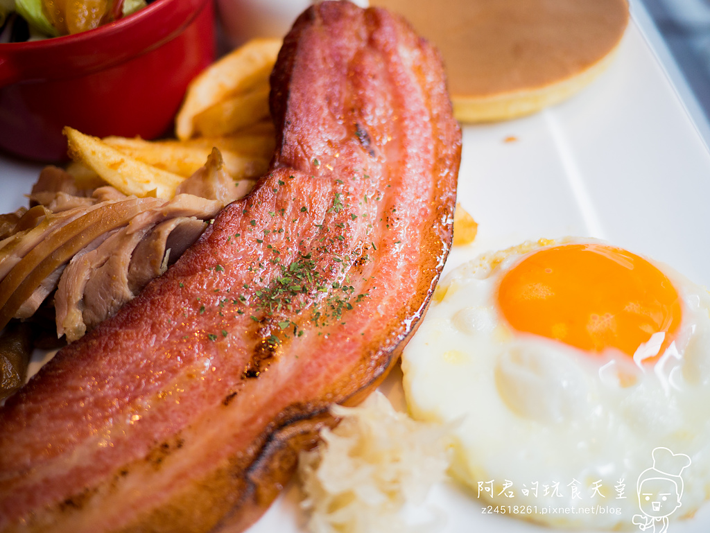 ▼最愛厚培根,旁邊還有沙拉、太陽蛋、薯條、燻雞跟鬆餅,份量十足。