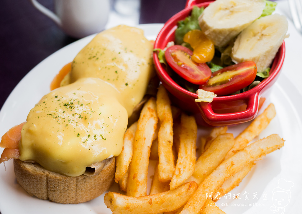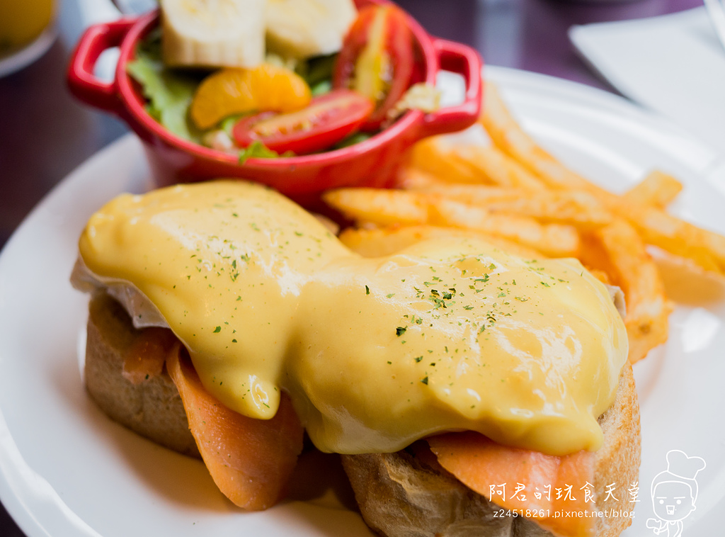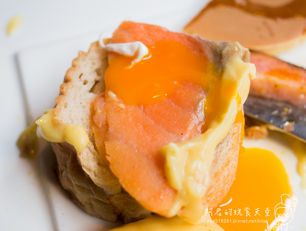 ▼鮭魚上面放上水波蛋,搭配店家特調的醬,想要直接咬是不可能的,只好先把蛋切破讓蛋液流出。