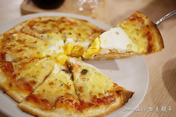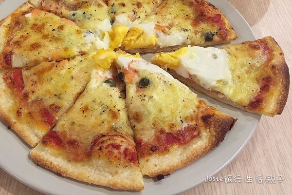 薄餅皮烤得酥脆、灑上起司再於披薩中間打了顆蛋