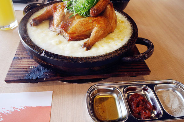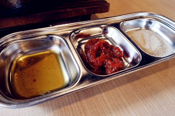 ♡三式沾醬分別由左至右是麻油以及韓式辣醬和胡椒鹽