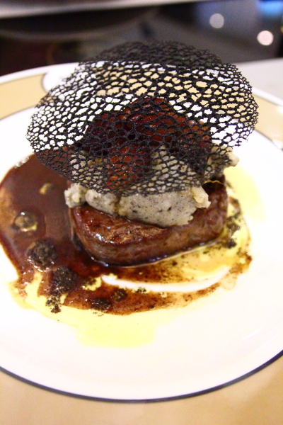 各種食材一層層疊起,最上層那網狀薄片,是以墨魚汁製成有如松露剖面的薄脆小點,脆而香鹹。第二層為香甜的小洋蔥,第三層為拌了黑松露的馬鈴薯泥,最底則 是五分熟的菲力牛排。馬鈴薯泥柔綿而香甜,有著淡淡松露香氣。牛排口感軟嫩而多汁,可以搭配醬汁、馬鈴薯泥、洋蔥一起食用,口感更為豐富且美味,或者單吃 牛肉也是十分香甜,可以沾點松露鹽提味,也是不錯的吃法。