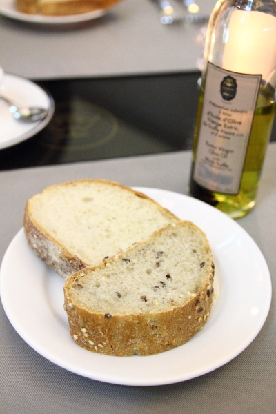 今天提供的麵包為法國麵包與雜糧麵包,不是熱的而是冷的,若要烤過的話,可以跟服務人員聲明。麵包的沾醬有綠橄欖醬與黑松露油。