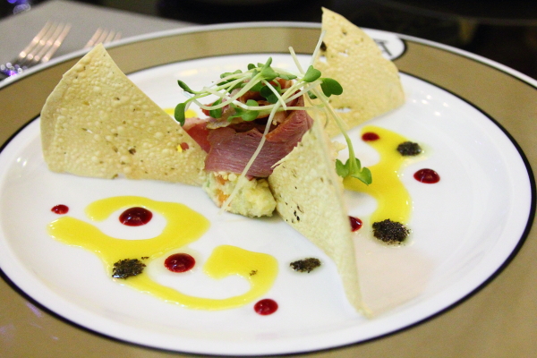 前菜為鴨肉卷加上馬鈴薯泥與辣脆餅,鴨肉為帶有煙燻味的鴨胸肉薄片,滋味清涼爽口,搭配著加了蘋果的馬鈴薯泥,更是清爽開胃。微辣香脆的脆餅同樣是十分開胃地小點。