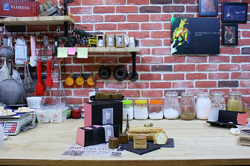 工作室位於小巷弄內,外觀上只像是一般住宅,張老師說他一直希望能將工作室開在交通方便,但隱密性極高的地方。走進工作室,不像是一般印象中的烘焙廚房的樣貌,反倒裝潢得美輪美奐,一進門便先看到整面的紅磚牆,牆上層架上除了懸掛著各式烘焙用具,晶亮的工具們沒使用時,看起來更像是裝飾品般美麗(結果有些是真的釘死當成裝飾的XDDD)