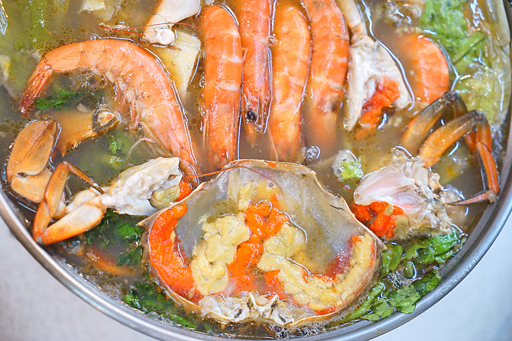 當紅蟳跟鹹水蝦下鍋到變熟後,再喝一次湯頭的味道又更鮮甜了,完全是不一樣的風味。