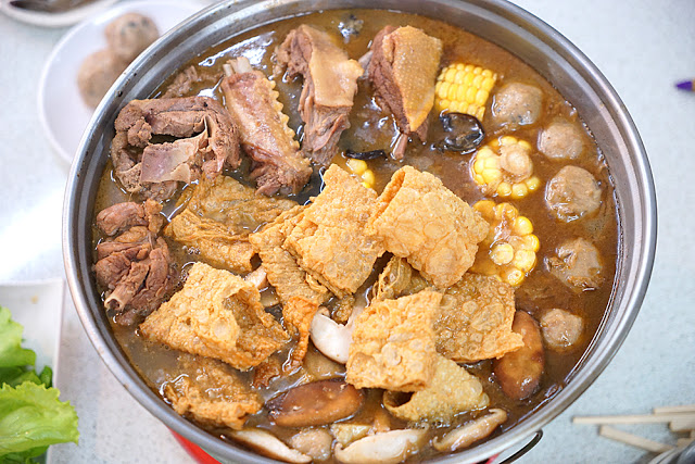 一鍋滿滿的料,看起來就很豐富,而且鴨肉每一塊都很厚實,玉米超甜,鴨丸Q彈,加上湯頭的味道濃郁,組合起來讓人看得食指大動,記得要先喝一口湯再吃肉唷!湯頭也有一些老薑的味道。