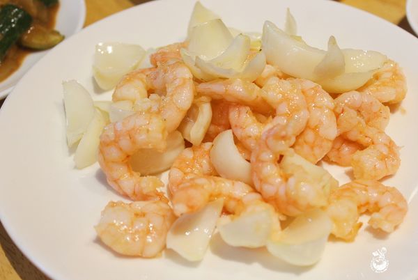 蝦仁嚴選東港直送的新鮮海蝦,經由型男老闆的巧手製作,口感鮮甜彈牙,搭配五香醋,以醋酸帶出甜度,搭配爽脆的百合,整體屬於較為清甜的料理