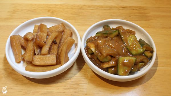 ▲招待的小菜,帶有花椒香氣的醃蘿蔔和黃瓜胡麻涼皮