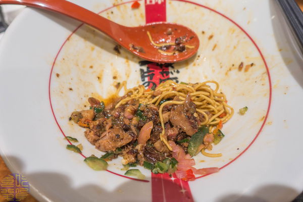 若不一口麵條一匙配料這樣吃法,到最後就會像照片那般剩一堆小肉塊在碗底,但混了BBQ醬的肉塊