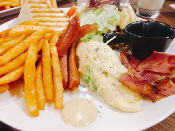內含法國麵包、德國香腸、培根、蛋捲、沙拉、薯條還有餐後水果