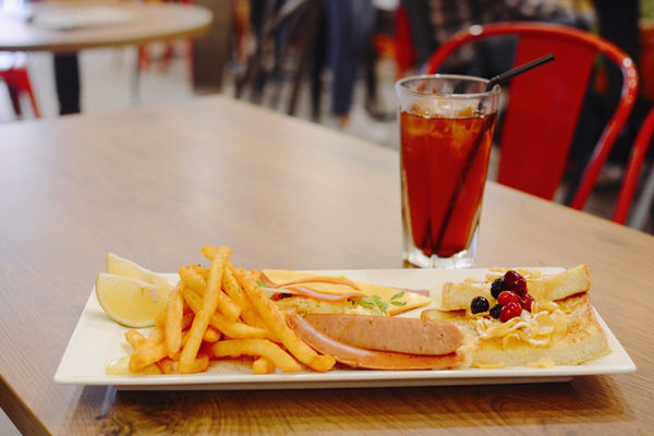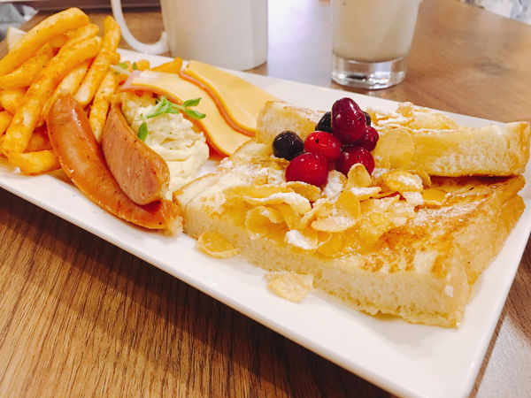 皇后拼盤內含一份法式吐司、德國香腸、火腿起司、嫩蛋及水果