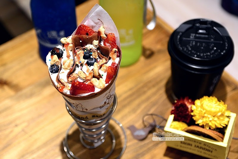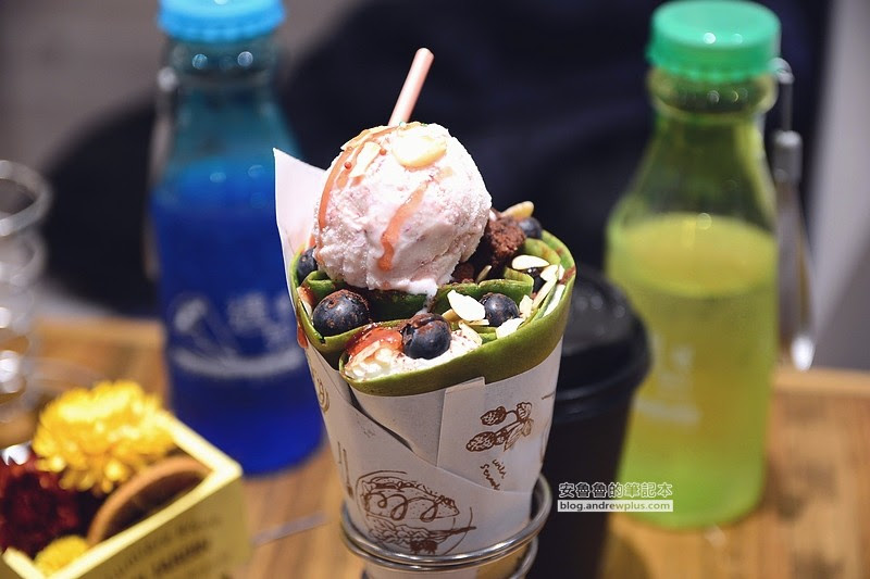 在和老板娘閒聊後,決定選擇了繽紛莓果搭配巧克力餅皮,藍莓布朗尼搭配抹茶餅皮再加一球起司草莓。店家製作過程能聞到陣陣巧克力和抹茶的香氣,口水都快流下來,連肚子也開始咕嚕咕嚕叫了,裝可麗餅的容器也很有趣,是螺旋的不鏽鋼小杯子,熊熊看很像是冰淇淋說!