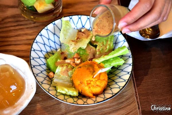 尤其推薦套餐附的蔬果好齊全沙拉 , 好喜歡胡麻醬