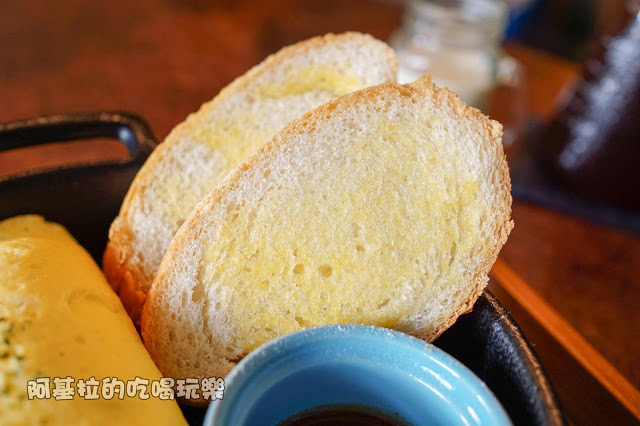 ▲兩片法式長棍麵包,上面有塗一層奶油,口感很酥軟,充滿麵包和奶油的香味。