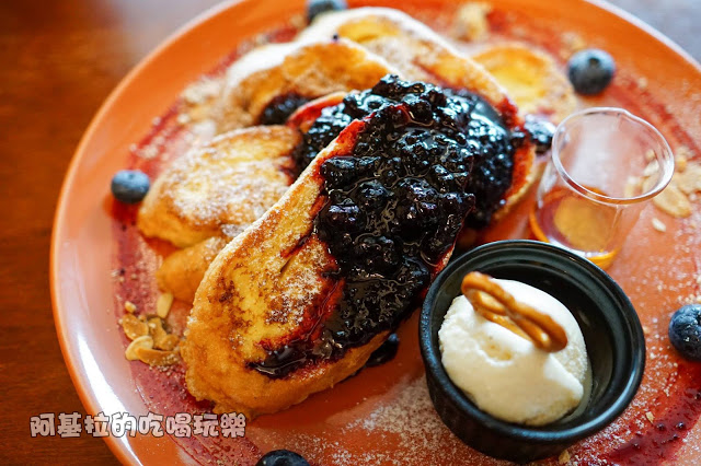▲法式長棍麵包上有塗一層蛋液,煎過之後,外層有嚼勁、內層很柔軟,充滿麵包和雞蛋的香味,加上搗碎的大量藍莓之後,增添了誘人的酸甜滋味,不僅好吃,而且營養價值高。