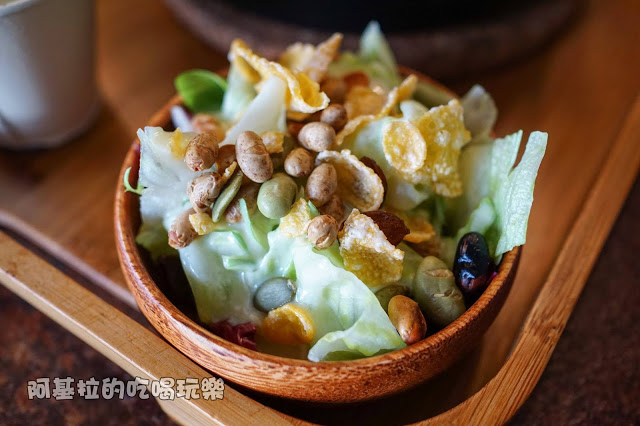 ▲沙拉的部份有蘿蔓、玉米片、豆子,已淋上少許甜中帶微酸的優格醬,清脆口感之中帶有一點豆香,健康又營養,整體來說還不錯,但是豆子有一點硬,對牙齒比較軟的人來說會有一點抗拒…