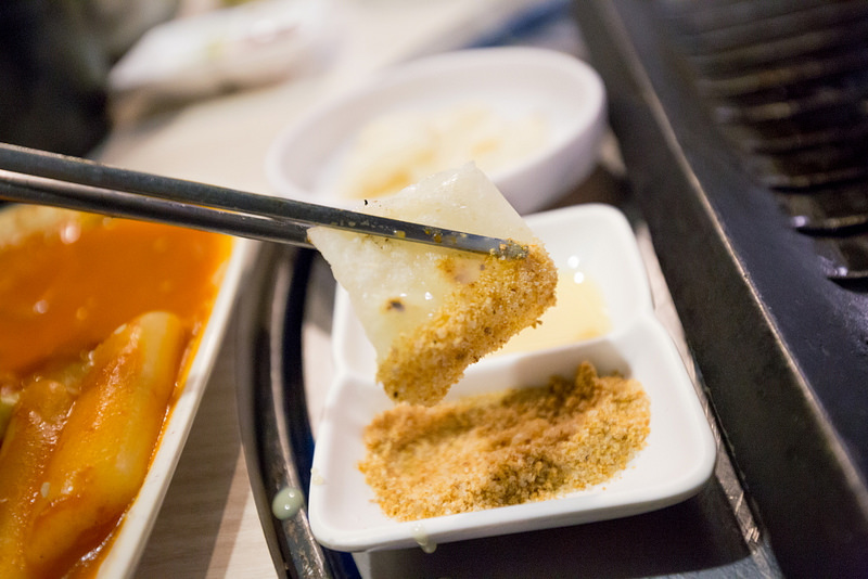 在牛肉和豬肉中間,安排辣炒年糕上場,看這份量讓人歪頭懷疑真的只有半份?先聊聊辣炒醬,偏辣,夠稠,很開胃,和在韓國吃到的版本相似度80%