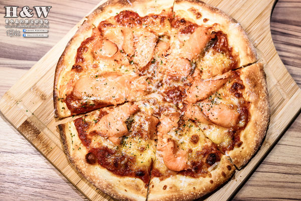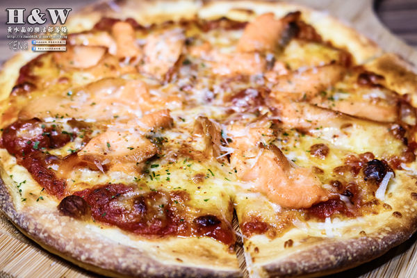這個披薩用了鮭魚入菜,餅皮屬於薄脆的口感,鹹香的起司滋味,