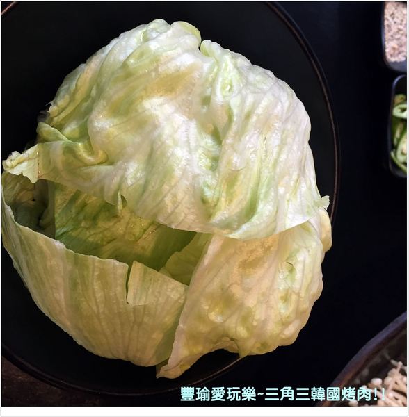 ●綜合蔬菜盤>>每一桌都會有一份喔,但要點套餐才有呢,點套餐真的還是比較划算呢,三角三都有服務人員為您桌邊服務喔,跟去首爾一樣,吃烤肉都有阿珠媽服務,但三角三是年輕的帥哥、辣妹喔,