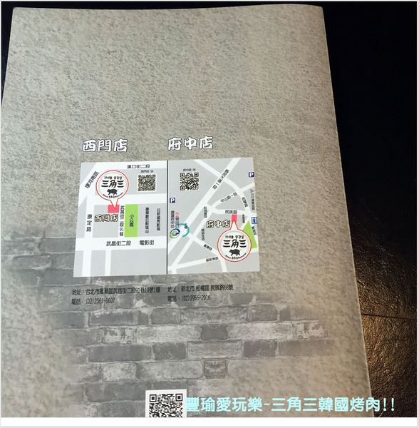 三角三目前有兩間店,西門店是韓國烤肉的,府中店還有多了雞料理專賣店喔。