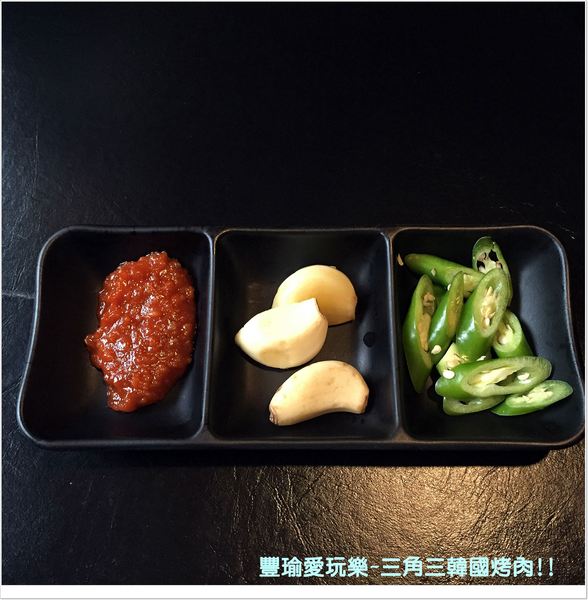 大蒜、辣椒、辣椒醬,豐瑜反而沒什麼沾辣椒醬呢,夾大蒜、辣椒就超好吃了呢,韓國的辣椒都是這種品種呢,豐瑜去首爾旅行時店家也都上此款辣椒呢,蒜頭可以跟著烤肉一起烤喔,口味很棒喔。