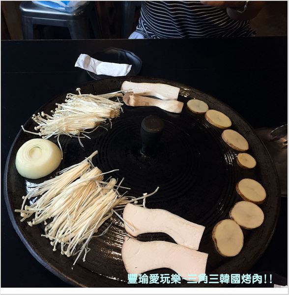 服務我們這桌的是一位年輕韓國辣妹喔,點好餐以後店員會幫你把綜合蔬菜放在鐵鍋蓋上面烤肉喔,
