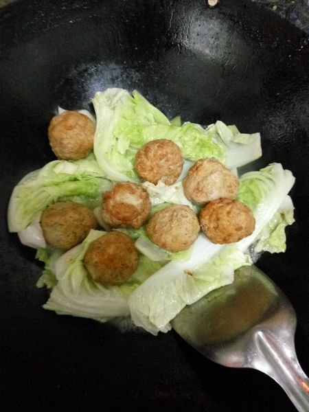 先將白菜爆香 再放入紅蘿蔔 煮軟 放入 八大顆獅子頭