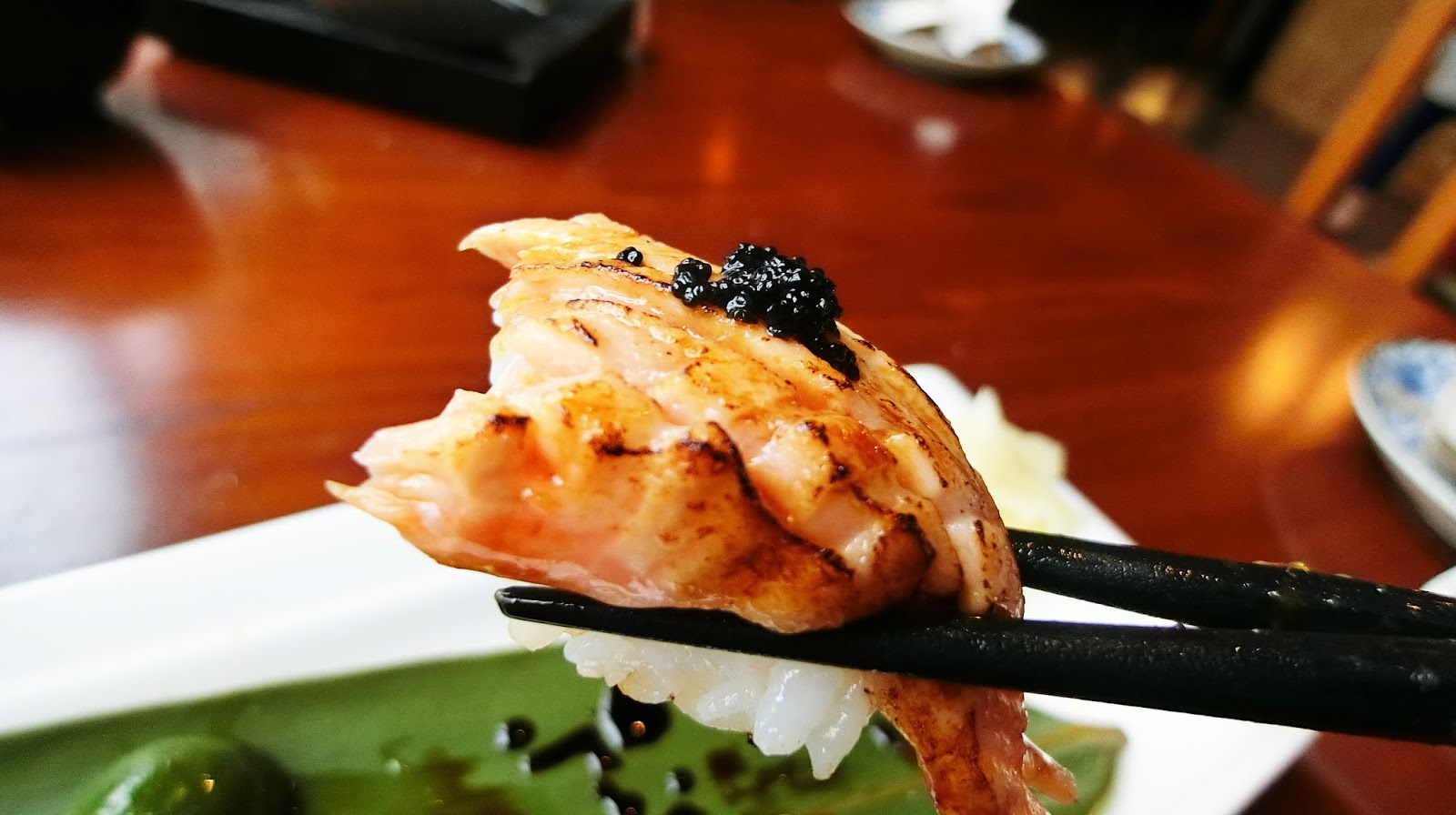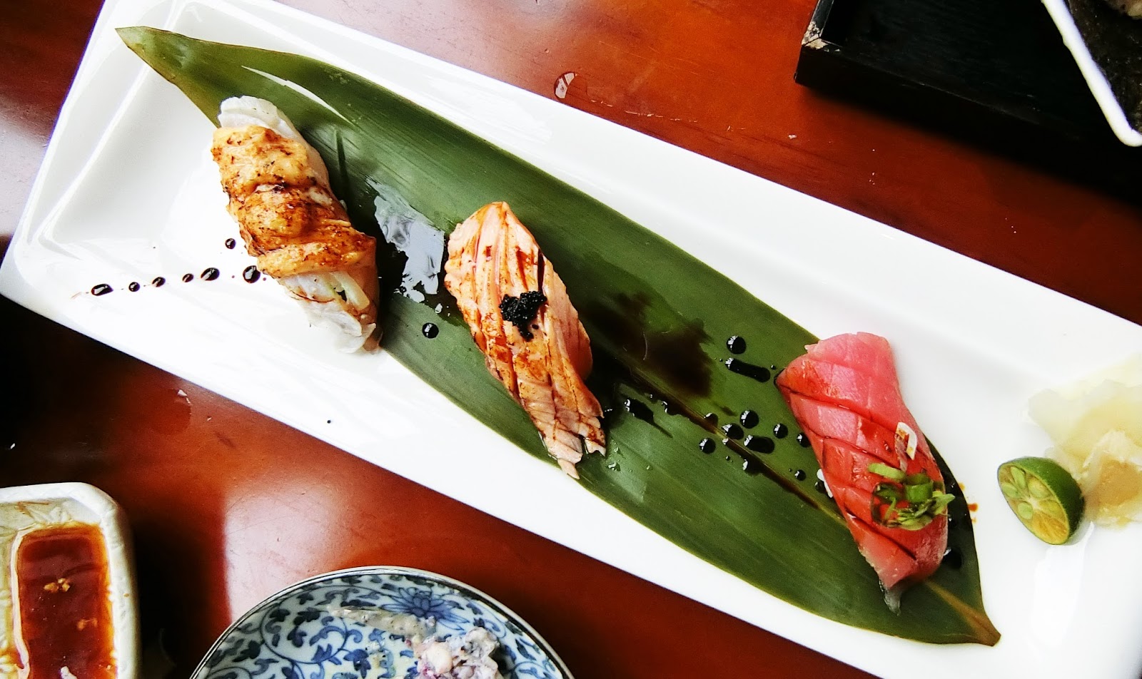 吃完後我去一下洗手間,回來就看到這盤三貫握壽司在我桌上,真的是很驚訝!原來還有(而且看起來很厲害),分別是炙燒鮭魚、鮪魚、炙燒旗魚搭配魚卵醬。鮭魚的部分是半熟,入口即化,本來沒有特別愛旗魚,因為它味道比較淡,但是搭上魚卵醬真的太強了,超級好吃!!!(建議放到最後一個吃,那個味道會留在嘴裡~)