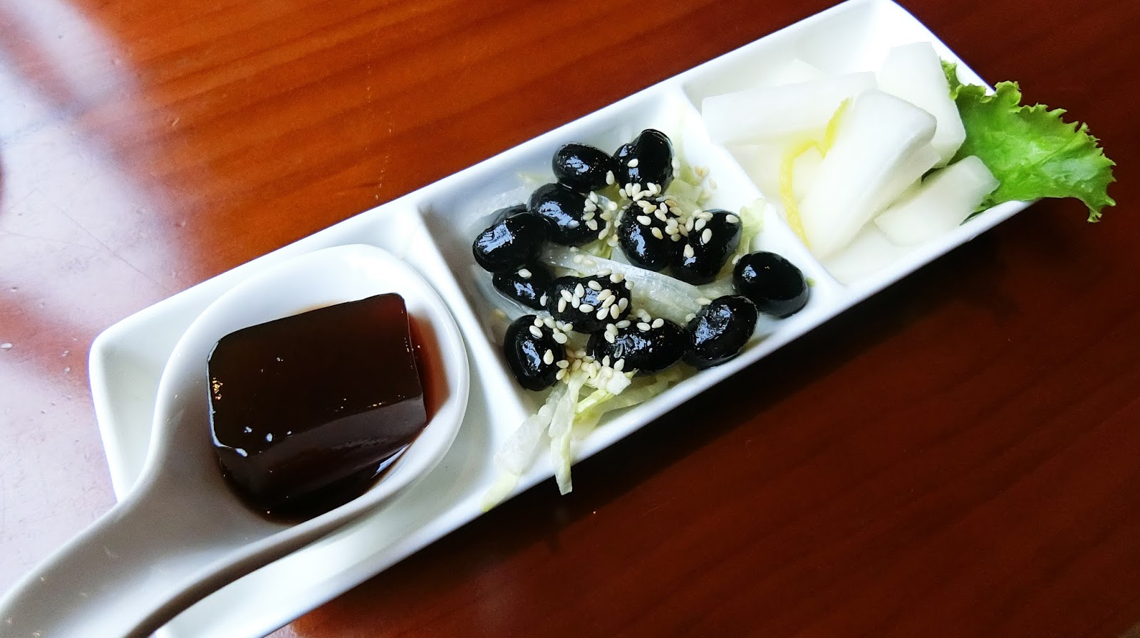 開胃菜-從右到左是柚香蘿蔔、日本黑豆、紅酒烏梅凍