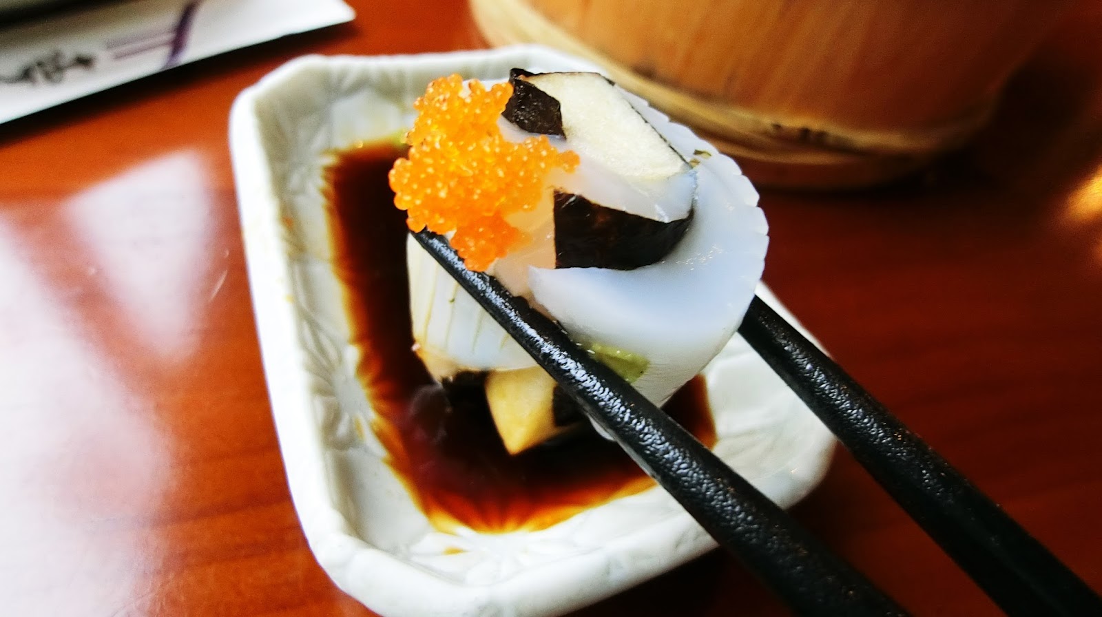 軟絲真的讓我嚇了一大跳,好Q軟好好吃啊,配上小小的魚軟和裡面配料脆脆的口感,結果綜合刺身裡面我最愛它。