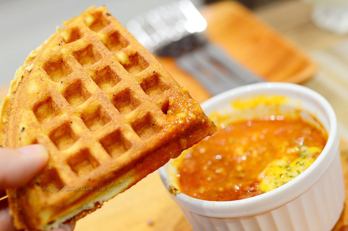 私房鬆餅的沾醬口味選擇相當多,除了起司肉醬,另外還有塔塔醬、芥末魚子、洛神莓果以及芒果。