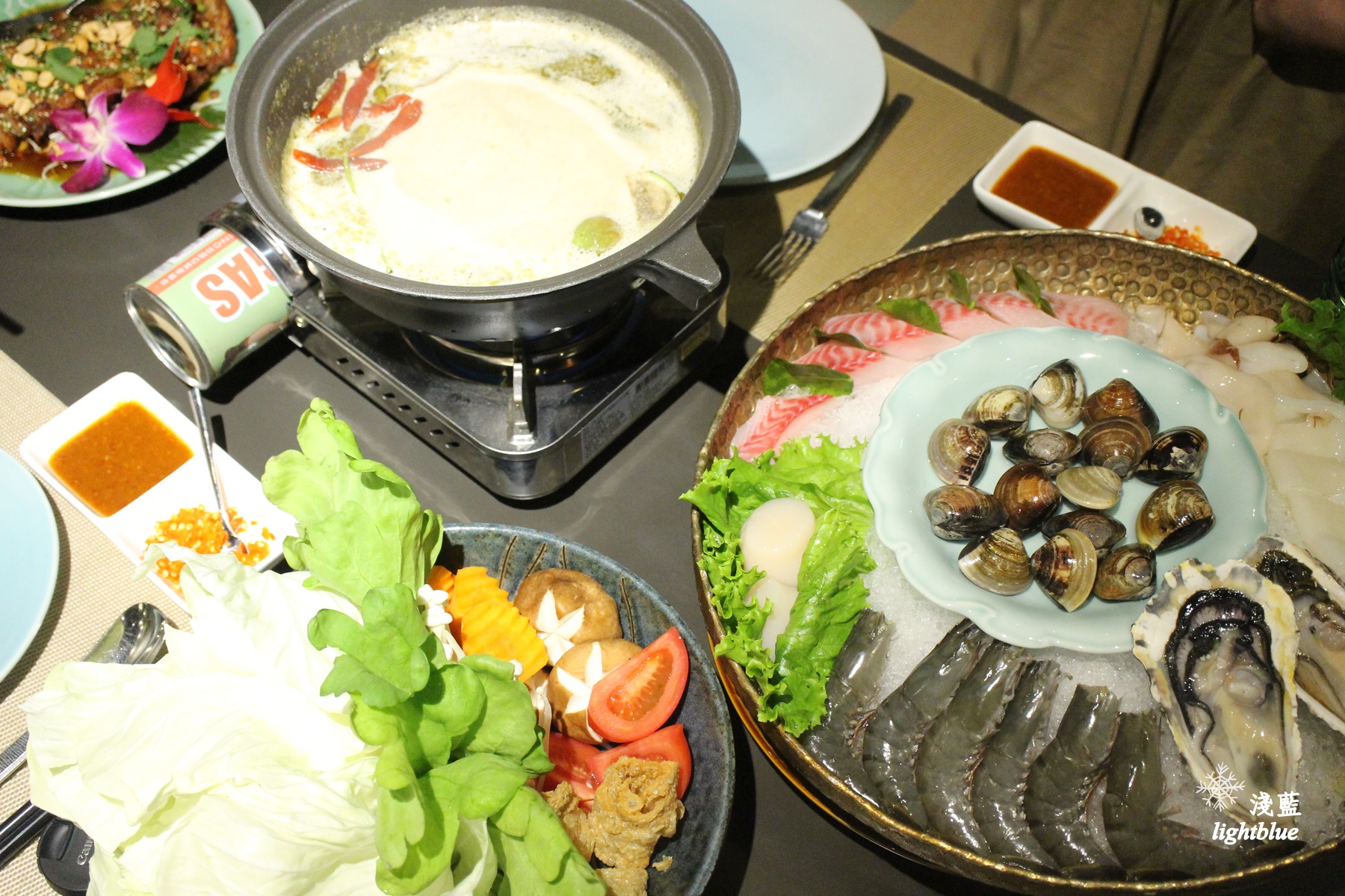 火鍋湯底有三種,這天我們體驗的是綠咖哩鍋,可以搭配海鮮或者肉盤,還都有附蔬菜盤跟泰式Ma Ma麵,雖說是兩人鍋,但我覺得點一鍋來搭配幾樣泰式料理,即使四、五個人聚餐也很夠份量