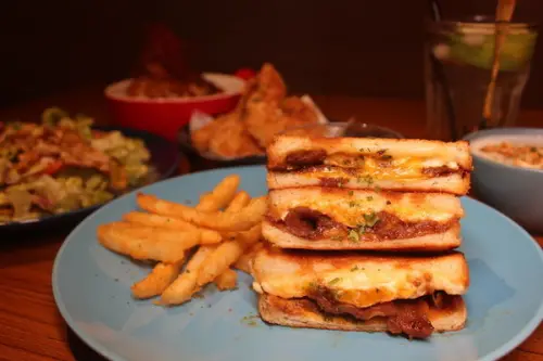 現烤的鬆餅加上鮪魚及起士,下層的鬆餅吃起來些微的酥脆,其上舖滿鮪魚與起士