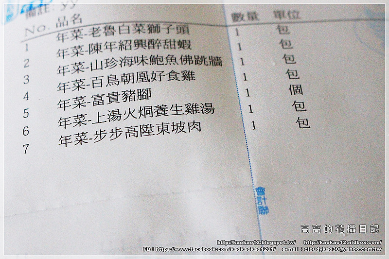 箱子內還附有一張出貨單,這邊就是我這次所有試吃年菜的全品項名稱啦!