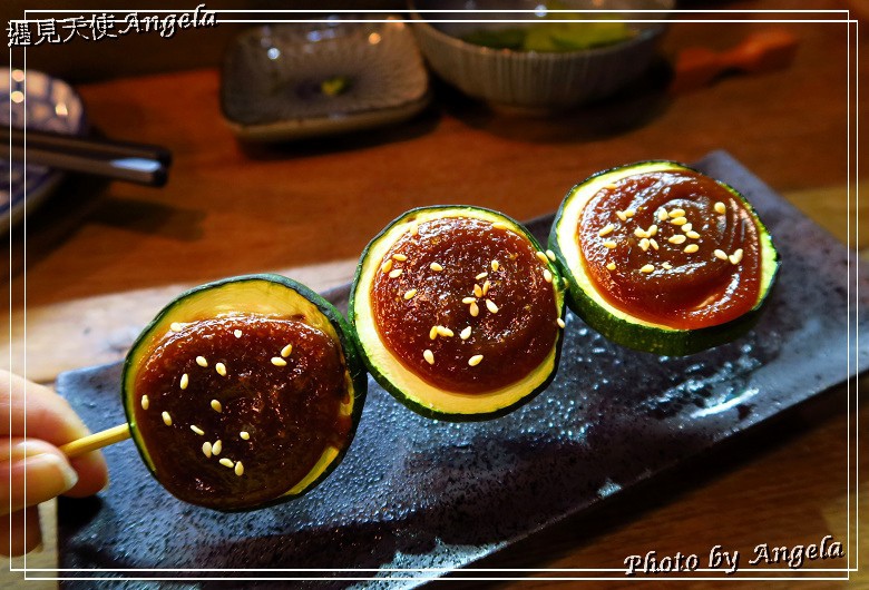 師傅簡單的微烤節瓜,之後再淋上獨家秘製的甜味噌醬料,微甜鹹的味噌配上厚實外脆內軟又多汁的節瓜,一整個味道很搭配!!