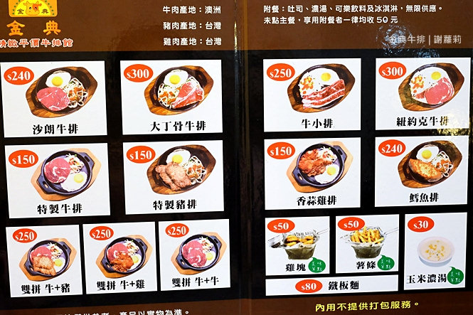 金典牛排最便宜的排餐以150元起跳,最貴也不會超過300元,而喜較豐富菜色的朋友,也有雙拚可以選擇,詢問了老闆最推薦哪道,他說如果以肉質來說,約紐客最出色,不過若要大碗滿意、高CP值,那麼就最是大丁骨囉!